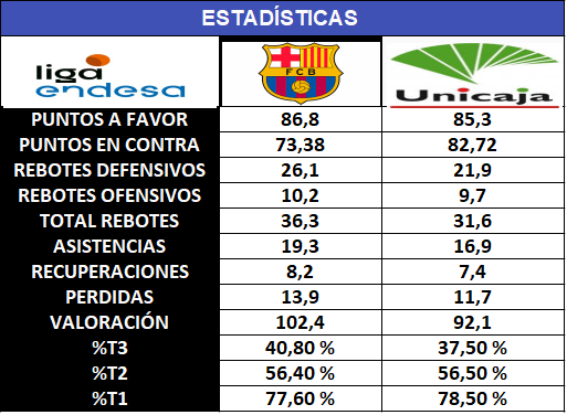 Si hacemos una comparativa entre ambos grupos atendiendo a las estadísticas que ambos equipos presentan en la competición observamos que los azulgrana se imponen a los malagueños en el apartado de puntos encajados, recibiendo casi 10 puntos menos por partido, cabe recordar que los de Jasikevicius son el equipo que menos puntos encaja de la Liga.